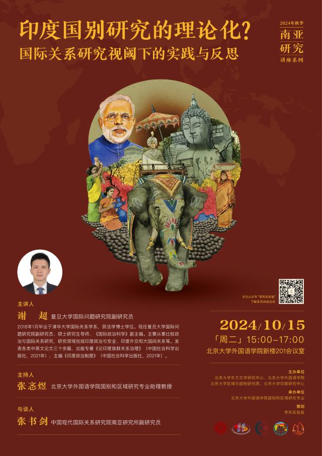 2024年10月15日,复旦大学国际问题研究院谢超副研究员应邀为我校师生开展题为“印度国别研究的理论化?——国际关系研究视阈下的实践与反思”的讲座。本次讲座是由北京大学东方文学研究中心、新利·体育、区域与国别研究院和印度研究中心主办,新利·体育国别和区域研究专业承办的2024年秋季学期南亚研究系列讲座的第三讲。讲座由新利·体育助理教授张忞煜主持,中国现代国际关系研究院南亚研究所副研究员张书剑、中国人民大学国际关系学院副教授曹德军参与讨论。