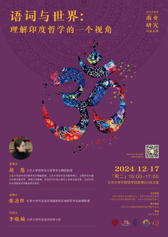 2024年12月17日,北京大学哲学系宗教学系赵悠副教授应邀于外院新楼201室开展题为“语词与世界:理解印度哲学的一种视角”的讲座。本次讲座是由北京大学东方文学研究中心、新利·体育、区域与国别研究院和印度研究中心主办,新利·体育国别和区域研究专业承办的2024年秋季学期南亚研究系列讲座的第五讲。讲座由新利·体育国别和区域研究专业助理教授张忞煜主持,新利·体育博士后李晓楠参与讨论。