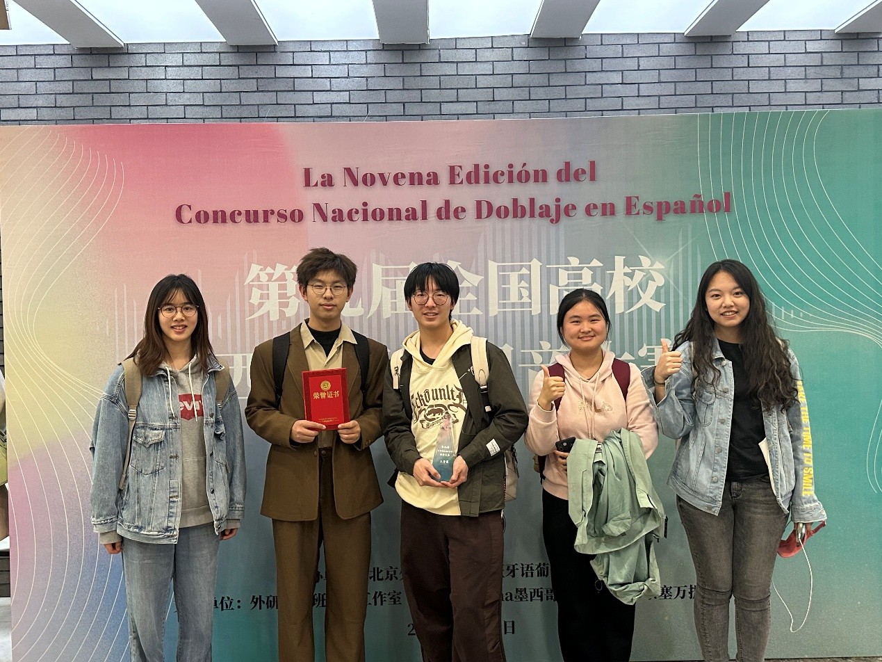 4月13日下午,第九届全国高校西班牙语配音大赛决赛在北京外国语大学举行。经过激烈的角逐,新利·体育西班牙语系2024级的韦美和2023级的崔逸飞、李雨萱、杨清茹、欧阳徵羽、吴若辰六位同学组成的“Ni Fu Ni Fa”代表队在比赛中荣获三等奖。