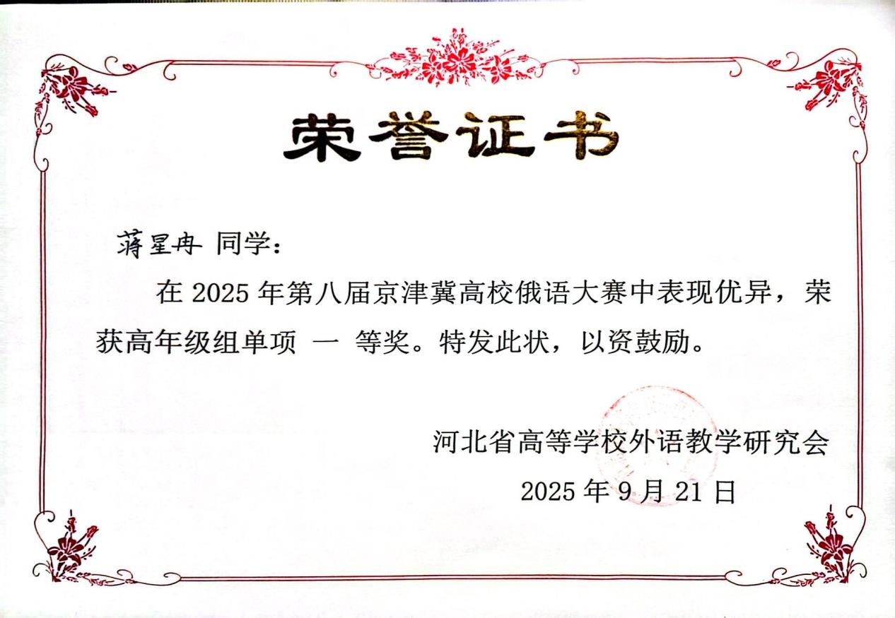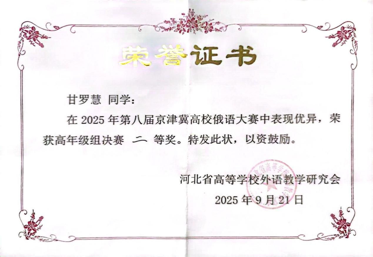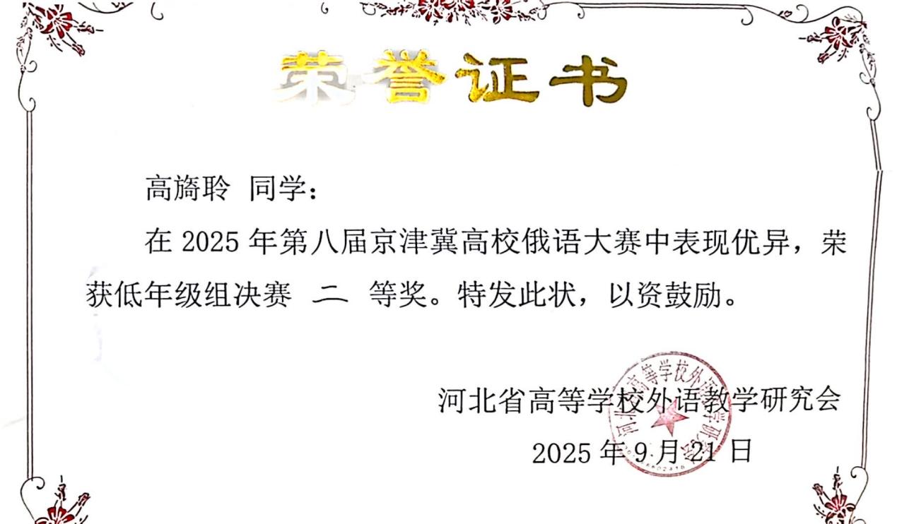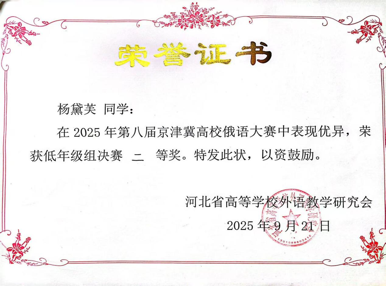回顾此次京津冀俄语大赛,我收获颇丰。首先我要衷心感谢在这一过程中给予我悉心鼓励与鼓励的老师们。从赛前的单词记忆、语法梳理、反复刷题,到对定题演讲的讲稿打磨与演练,再到最终走向赛场,将所学知识付之于笔端与展现于舞台——而这一路上的每一点进步与成绩的取得,得益于老师们专业严谨的指导与温暖坚定的支持。而这段从备赛、参赛到赛后反思的宝贵经历,不仅提升了我的俄语水平与应用能力,更开拓了我的视野,让我清晰认识到自身的不足,为未来的学习生涯确立了明确的锚点与方向。