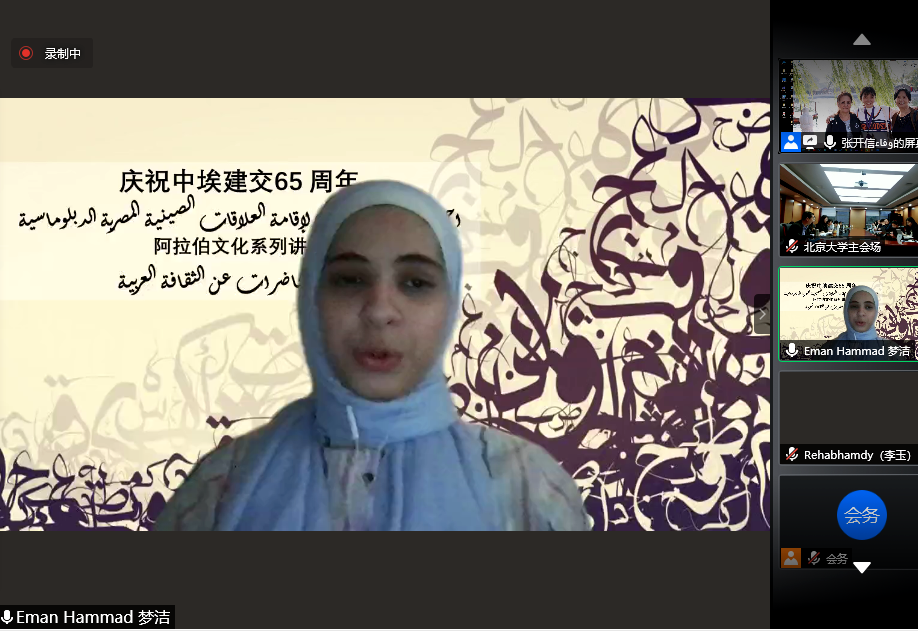 为庆祝中埃建交65周年,继成功举办北京大学与开罗大学“中国文化春令营”活动之后,两校又进行了新一轮的合作,于5月7日至8日联合举办“阿拉伯文化春令营”系列讲座。本次系列讲座线上线下协同进行。出席开幕式的有开罗大学文学院院长谢里夫•沙欣(Sherief Shahin)、文学院中文系主任兼孔子学院院长李哈布(Rehab),文学院阿拉伯语系教授阿扎•席波乐(Azza Shebl),中文系教师李玉(Rehab)、梦洁(Eman)、夕文(Salma),新利·体育副院长付志明、阿拉伯语系主任林丰民、叙利亚籍专家哈穆德•优尼斯(Hamoud Younes)、叙利亚籍专家赛米拉•萨拉玛(Samira Salami)、阿拉伯语系长聘副教授廉超群、讲师袁琳、助理教授李海鹏、埃及籍博士后高山(Alaa Mamdouh Akef)及阿拉伯语系40余名学生。