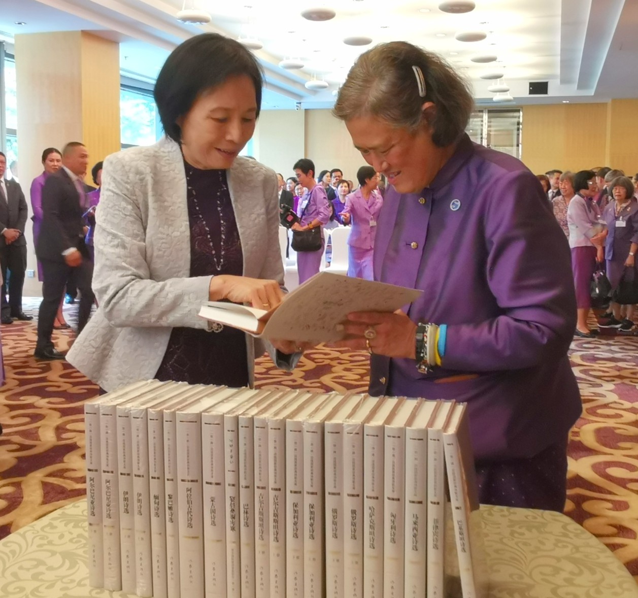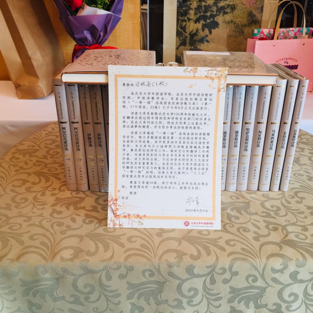 2019年9月29日下午,泰王国诗琳通公主在参加完中华人民共和国国家勋章和国家荣誉称号颁授仪式之后,前往北京丽思卡尔顿酒店宴请前任中国驻泰大使和公主的汉语教师代表。我国泰语界著名专家、翻译家、诗琳通讲席教授裴晓睿受邀参加了此次宴请活动,并作为译者之一向公主赠送了由北大新利·体育、北大中国诗歌研究院和作家出版社联合策划出版的《“一带一路”沿线国家经典诗歌文库》(第一辑)一套。