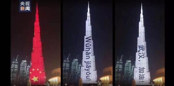 阿联酋地标哈利法塔为抗疫的中国亮灯