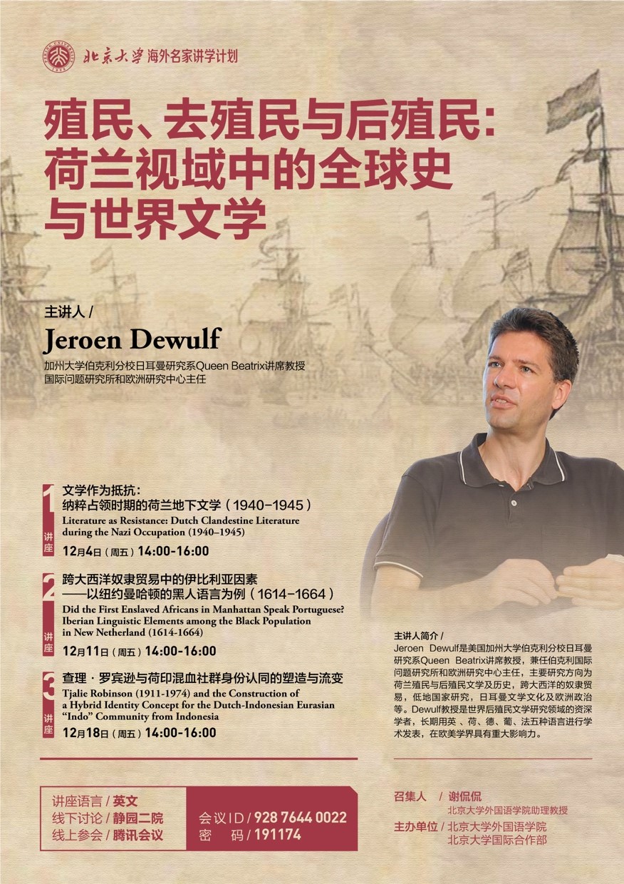 2020年12月,新利·体育在国际合作部“海外名家讲学计划”的支持下主办了三场题为“殖民、去殖民与后殖民:荷兰视域中的全球史与世界文学”的系列讲座。主讲人杰罗恩•德伍夫(Jeroen Dewulf)是加利福尼亚大学伯克利分校日耳曼研究系贝娅特丽克丝女王讲席教授(Queen Beatrix Chair Professor),兼任伯克利国际问题研究所和欧洲研究中心主任,主要研究方向为荷兰殖民与后殖民文学及历史,跨大西洋的奴隶贸易,低地国家文化,日耳曼文学及欧洲政治等。德伍夫教授是世界殖民与后殖民研究领域的资深学者,长期用英 、荷、德、葡、法五种语言进行学术发表,在欧美学界具有重大影响力。受疫情影响,德伍夫教授未能到达燕园现场,因此系列讲座以线上线下相结合的方式进行,演讲同时在腾讯会议、哔哩哔哩等网上平台上直播,吸引了北京大学校内外的众多学者和同学观看、学习和讨论。