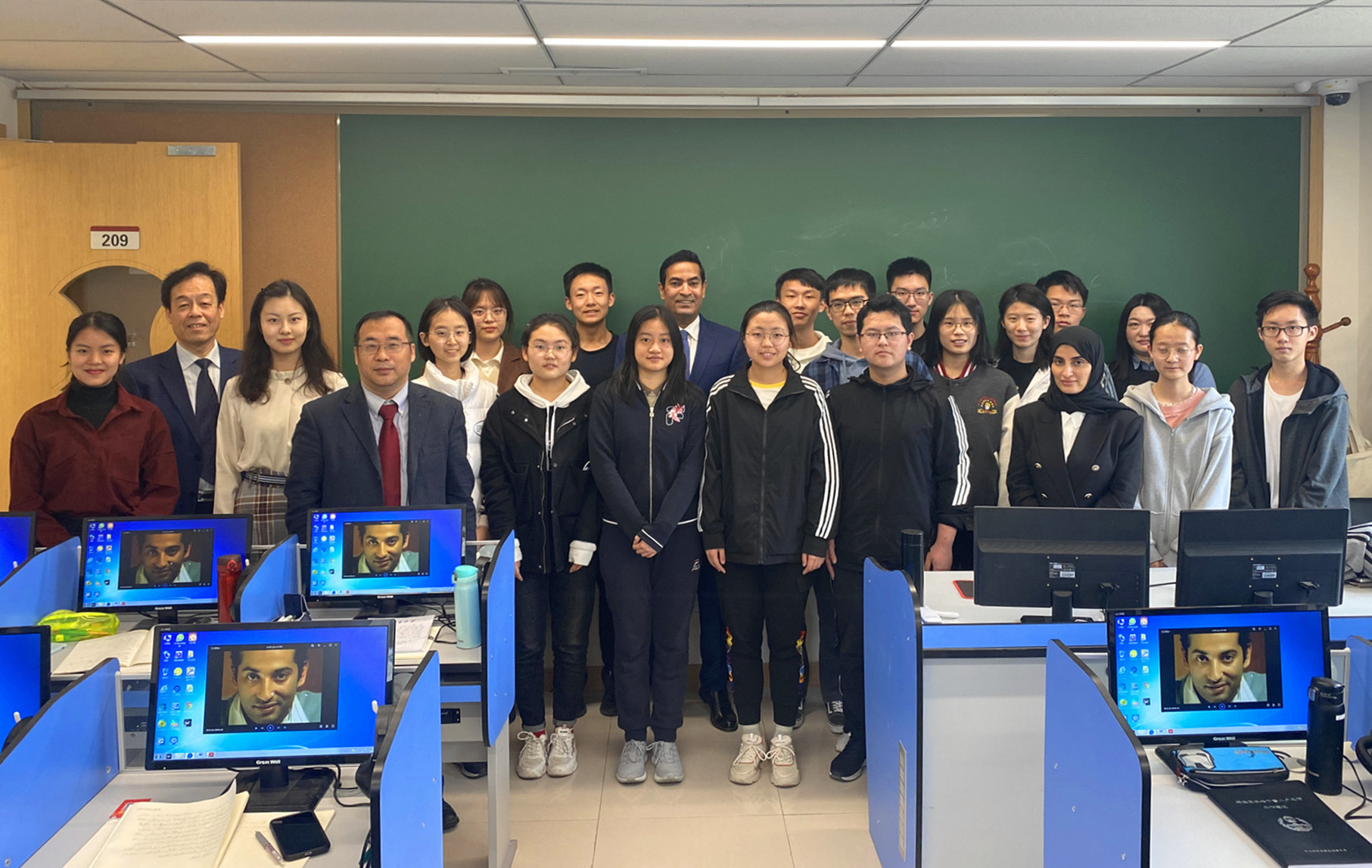 随后,杜希米大使与阿语系20级本科生进行了会面。20级阿拉伯语本科班曾于2020年12月3日受邀请前往大使官邸交流。再次见面,大使愉快的回忆起初次见面的美好场景,兴致勃勃的叫着同学阿拉伯语名字。杜希米大使首先问候了同学们的学习状况,鼓励大家勤加练习阿拉伯语。王心怡同学代表全体同学用阿拉伯语感谢大使邀请参观官邸,领略阿拉伯文化,并表示会努力学习,希望有机会赴卡塔尔留学,成为中卡文化交流的使者。随后,同学们用阿拉伯语叙利亚方言共同歌唱了阿拉伯语歌曲《心跳》以示欢迎。杜希米对同学们在不到一年内所掌握的阿语知识和对阿拉伯文化的热爱表示赞赏,并邀请同学们再次到卡塔尔驻华大使官邸做客。他说:“希望之后能再次与大家见面,到时候要看看你们的阿语学习进步了多少”。见面结束前,许政哲同学代表全体同学们向大使一行赠送北大文化衫作为纪念,双方合影留念。杜希米大使还参观了阿卜杜勒·阿齐兹国王公共图书馆北京大学分馆。