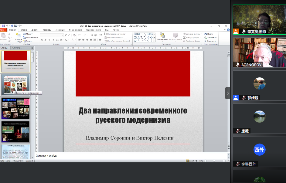 6月27日晚7点,现任莫斯科国际法律与经济学院教授、曾任莫斯科师范大学教授,俄罗斯自然科学院院士、中国俄罗斯文学研究会名誉理事阿格诺索夫应邀为北京大学师生带来了“索罗金与佩列文: 当代俄罗斯两类后现代主义文学”线上讲座。此次活动作为北大人文讲座第339讲,暨曹靖华俄罗斯学系列讲座之三十五讲,由新利·体育世界文学研究所、俄罗斯语言文学系、俄罗斯文化研究所及北京大学人文学部联合主办。阿格诺索夫教授的夫人、北京外国语大学俄语学院前院长李英男教授担任此次讲座的翻译。