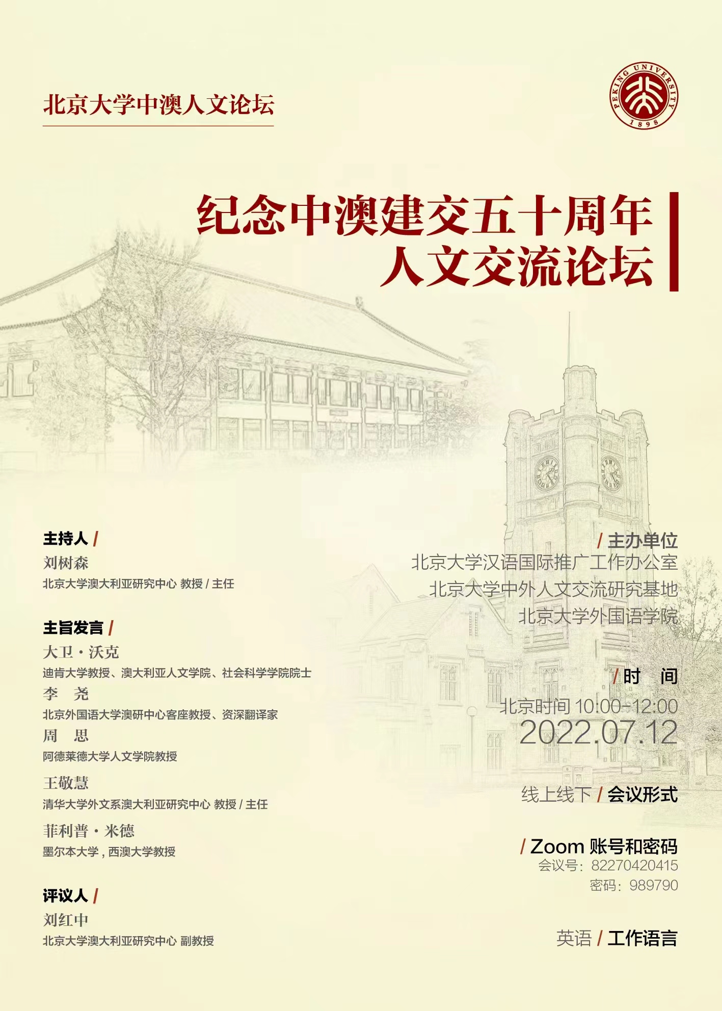 7月12日,由北京大学汉语国际推广工作办公室、北京大学中外人文交流研究基地、新利·体育联合主办的“庆祝中澳建交五十周年人文交流论坛”通过线上线下相结合的方式成功召开。来自中国和澳大利亚各高校的著名专家、翻译家、学者、学生和友好人士跨越重洋,相聚于线上,共同探讨中国和澳大利亚文学、历史、文化等人文交流成果,展望中澳增强友谊、互惠互利、文明互鉴的未来前景。