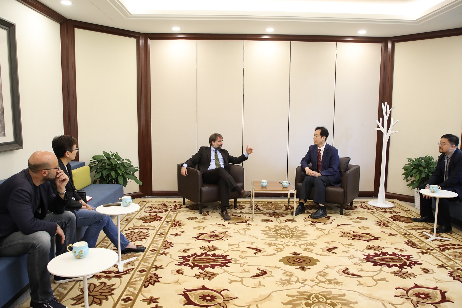 随后,代表团一行来到外文楼,与副院长付志明教授进行了会面。付志明教授对参赞一行的来访表示热烈欢迎,并向参赞介绍了北大外院意大利语专业成立历史及发展情况。菲德利克参赞表示将继续支持北京大学意大利语专业的发展,帮助促进意大利高校与北大意语专业在学术与学生方面的交流,合作举办各类学术及文化活动。双方围绕进一步开展交流与合作进行了深入的探讨。一同来访的还有意大利驻华使馆文化处参赞助理王蕾蕾女士、那不勒斯东方大学Enrico Fardella教授。