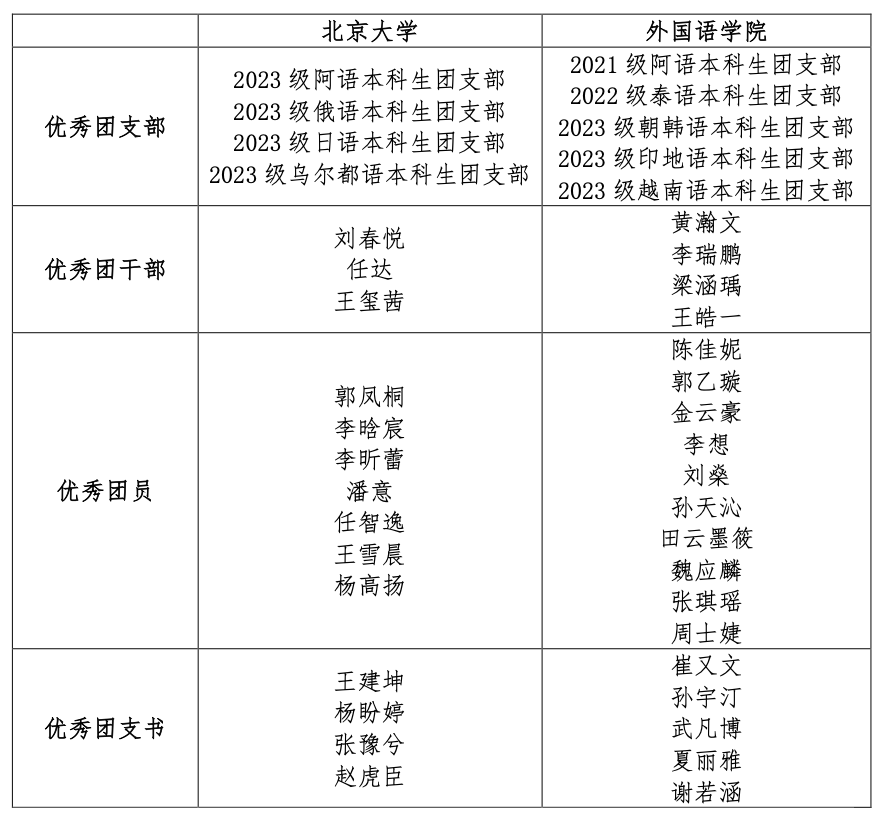 为深入学习贯彻习近平新时代中国特色社会主义思想,深化共青团改革,调动基层团组织的积极性、主动性和创造性,全面构建基层团组织“凝聚青年、服务大局、当好桥梁、从严治团”四维工作格局,引导广大青年坚定理想信念,扣好人生的第一粒扣子,踔厉奋发、勇毅前行,努力成为德智体美劳全面发展的社会主义建设者和接班人,争做有理想、敢担当、能吃苦、肯奋斗的新时代好青年,根据《北京大学共青团系统评优实施办法》,院团委组织开展了2023—2024学年共青团系统评优表彰工作。经基层团组织推荐和个人申报、院系审核、评选等环节,产生2023—2024学年共青团系统先进集体和先进个人等院级奖项获奖名单和校级奖项推荐名单。