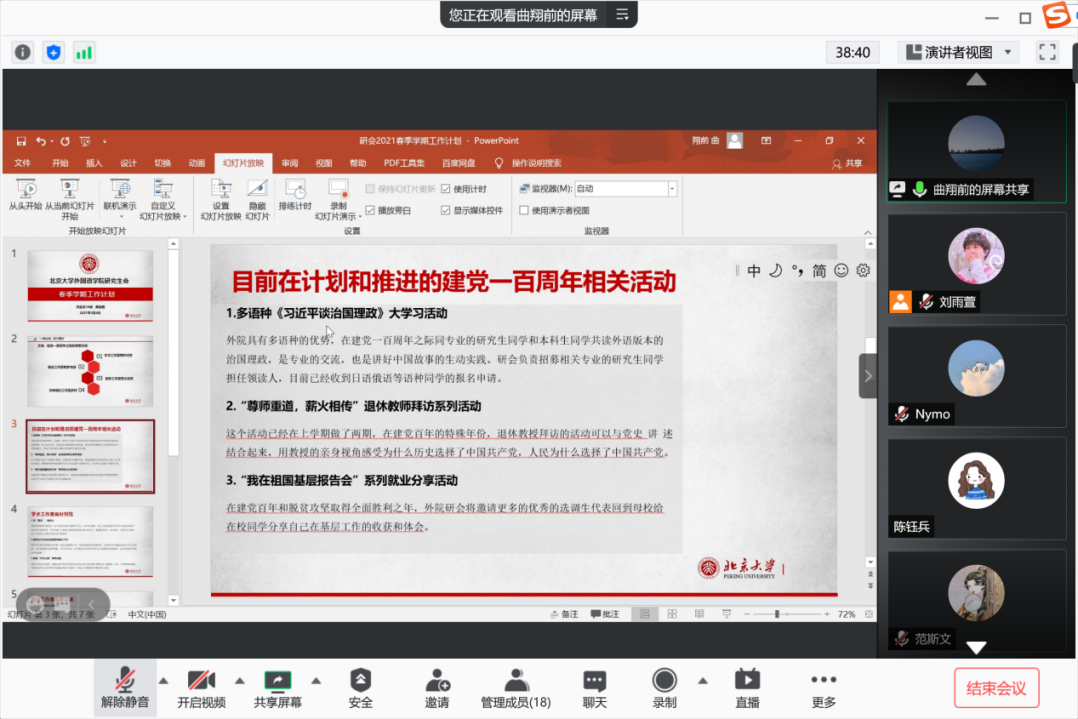 会上,各组织首先分别介绍了本年度工作计划,尤其是迎接建党100周年系列活动的策划和进展情况。本学期,在学院党委的指导下,学院将围绕迎接建党100周年这一重大节点,开展系列学习、实践、文体活动,并在活动中构建全面合作、支持和宣传体系,带领全院同学共庆建党100周年,认真学好党史,树立理想信念。各部门结合既往工作经验和部门特色,分别制定了相关活动方案,部分活动已在推进过程中。