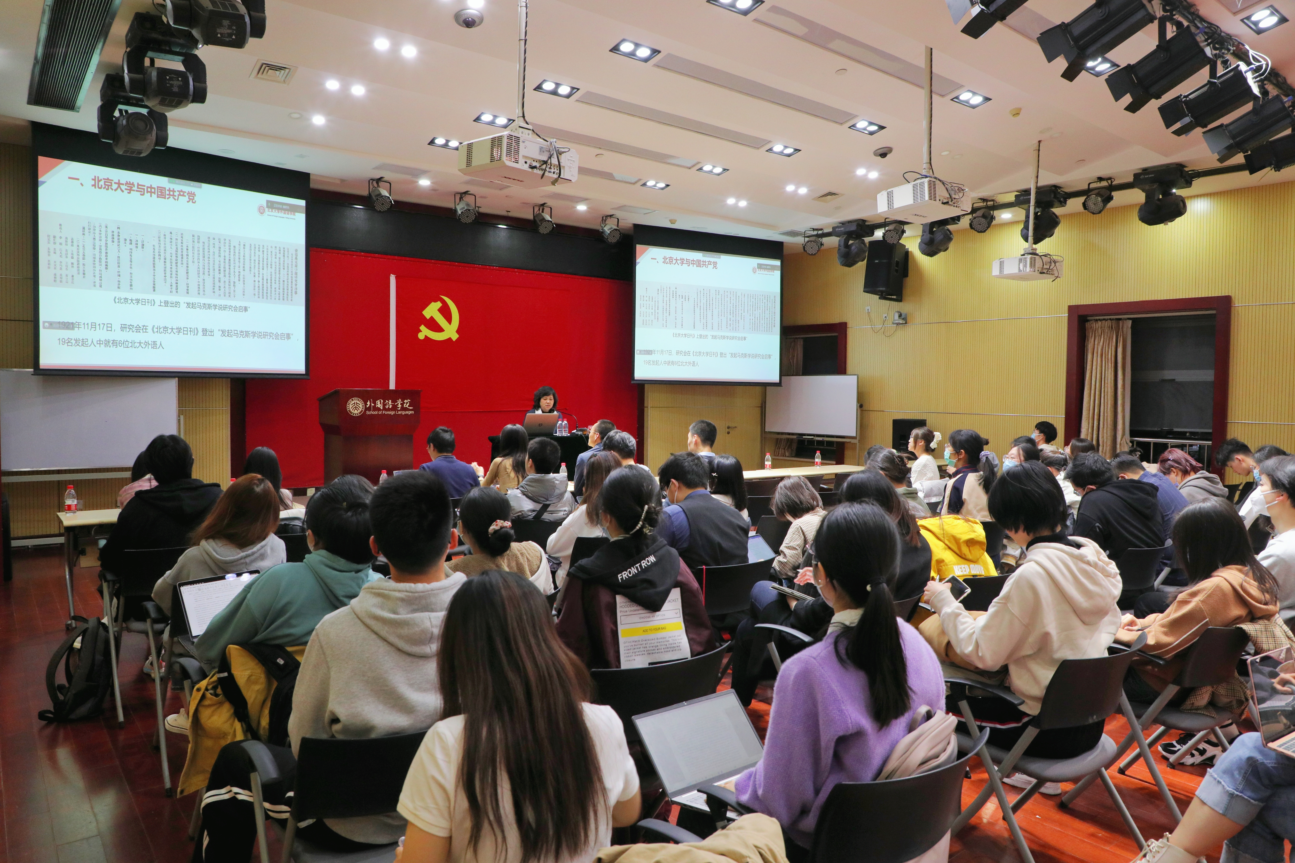 在报告第二部分,李淑静将个人融入学校的发展历程,讲述自己对于优秀共产党员特质的认识。回望历史,北京大学作为新文化运动中心和“五四”运动策源地,作为中国最早传播马克思主义和民主科学思想的发祥地,作为中国最早传播和研究马克思主义的地方,诞生了李大钊、王复生、范鸿劼等一批为党和国家发展作出重要贡献的进步思想家,其中不乏北大外语人鞠躬尽瘁、奔走呼号的身影。立足当下,于敏、屠呦呦、樊锦诗等一个个响亮而有分量的名字回荡在未名湖畔、博雅塔下。他们用博古通今的学识与肯坐冷板凳的坚毅,急国家之所急,应人民之所需,将论文写在祖国的大地上。聚焦身边,从“党要干啥就干啥”、干一行爱一行,九十岁高龄依然亲力亲为、笔耕不辍的胡壮麟老先生;到发挥自身专业所长,用文字书写冬奥志愿服务另一条战线的外院多语种翻译团队;再到不顾疫情风险深入非洲难民社区,以青年温度传递中国温暖,用青春绘就推动构建人类命运共同体绚烂华章的朱睿智……李淑静用身边人的榜样故事生动诠释了“全心全意为人民服务”“为实现共产主义奋斗终身”的时代内涵,激励外院广大师生党员在组织、思想和行动上同步入党,心怀国之大者,秉持坚定信念,坚守初心使命,用所学沟通世界,用脚步丈量世界,践行新时代青年的责任与担当。