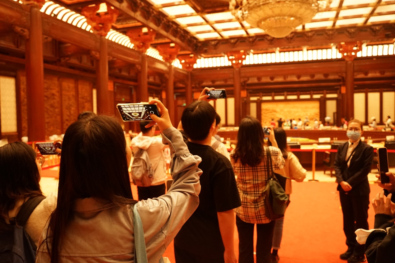 随后,实践团赴“会都”——北京雁栖湖国际会展中心参观。雁栖湖国际会议中心曾承办2014年APEC峰会以及首届与第二届“一带一路”国际合作高峰论坛圆桌峰会。师生一行跟随讲解员参观集贤厅,聆听讲解员讲解集贤厅室内设计的点滴思考与幕后故事,通过室内装潢与陈设,亲身感受峰会盛况。置身集贤厅内,汉唐气象与明清气派并举,古色古香与现代风格交融,融通古今,博雅东西,共同构成我国外交接待空间与国家礼仪空间的新地标,迸发出现代中国的文化自信与壮阔气势。建筑之美彰显人文之美,实践团师生在通过视觉、听觉近距离感受中国传统建筑的文化底蕴与艺术魅力的同时,也愈发坚定行语言专业所长、做文化交流使者的决心。国际盛事与大国外交呼唤扎根本土、放眼世界的复合型语言人才,新利·体育师生大有可为也必将大有作为。