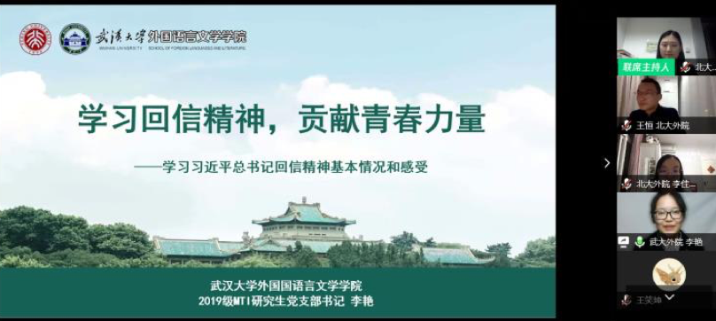 武大外院2019级研究生MTI党支部书记李艳分享了支部同学学习总书记回信精神的心得体会,讲述了支部党员在疫情中的积极行动,立志做堪当大任的中国青年。