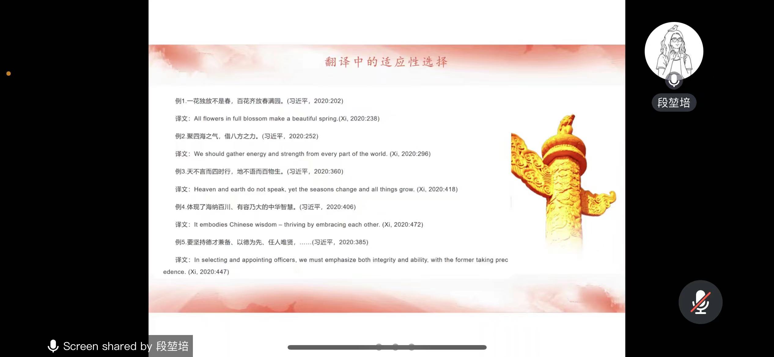 4月21日,2022级硕士生、领读者张宇淏宣讲了以“两会概况双语共学”为主题的共学内容,包括两会韩国报道、两会相关专有名词、两会议程相关内容学习。之后,2022级硕士生、领读者张可佳宣讲了“政府工作报告双语表述”的共学内容,包括过去一年和五年工作回顾、今年发展主要预期目标、对今年政府工作的建议双语学习。5月19日,张宇淏宣讲了《中国关键词:治国理政篇》(上)”,包括中国共产党人的初心和使命、在发展中保障和改善民生、钉钉子精神等相关内容学习。之后,张可佳宣讲了《中国关键词:治国理政篇》(下),包括双语共学创新型国家、雄安新区等相关内容。